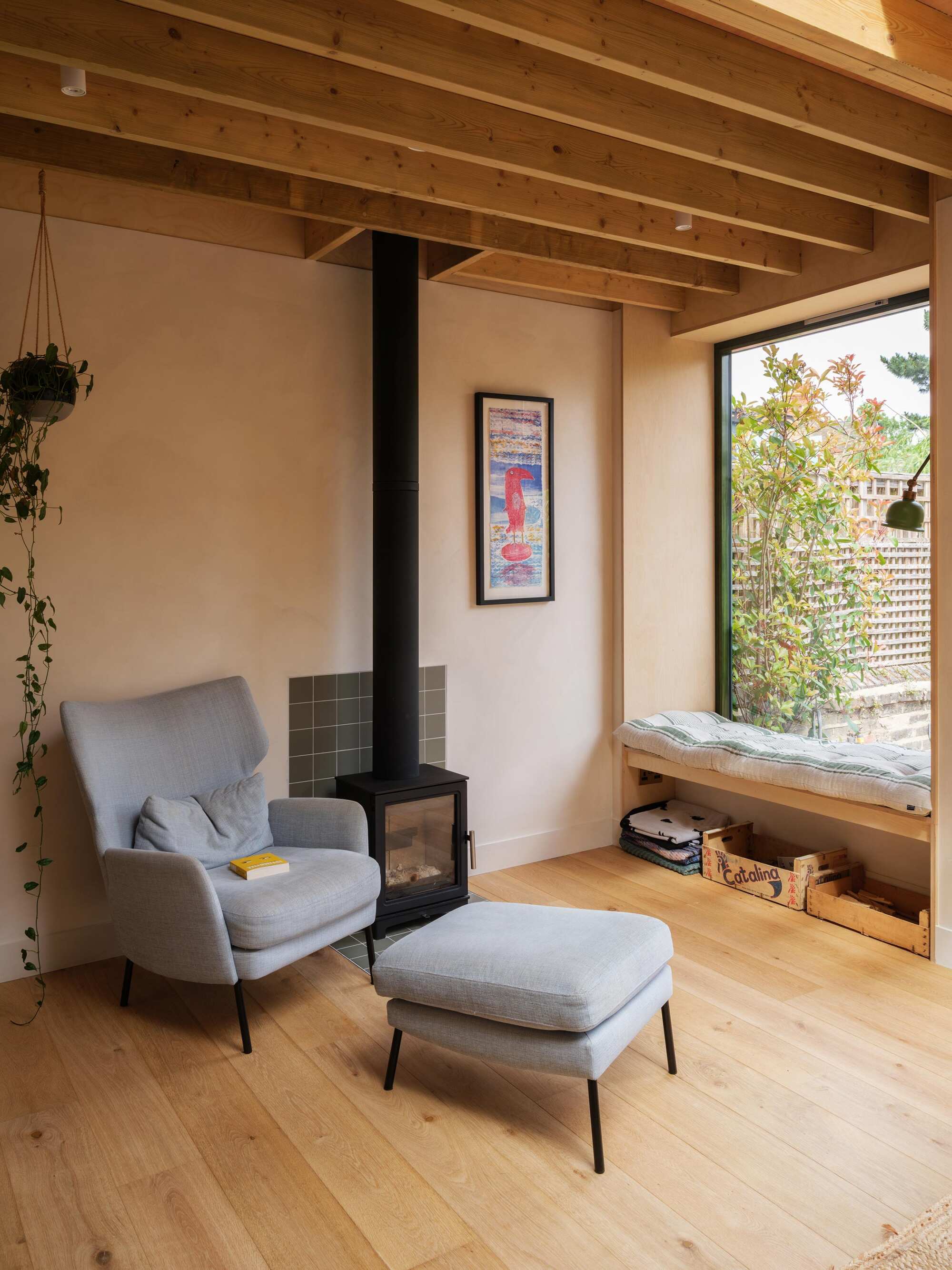 Supporting the family’s daily life, the extended ground floor is organised into distinct areas for cooking, eating and working, with a woodburner corner for quiet moments. Built-in storage, desk and window seat define particular places without dividing them.